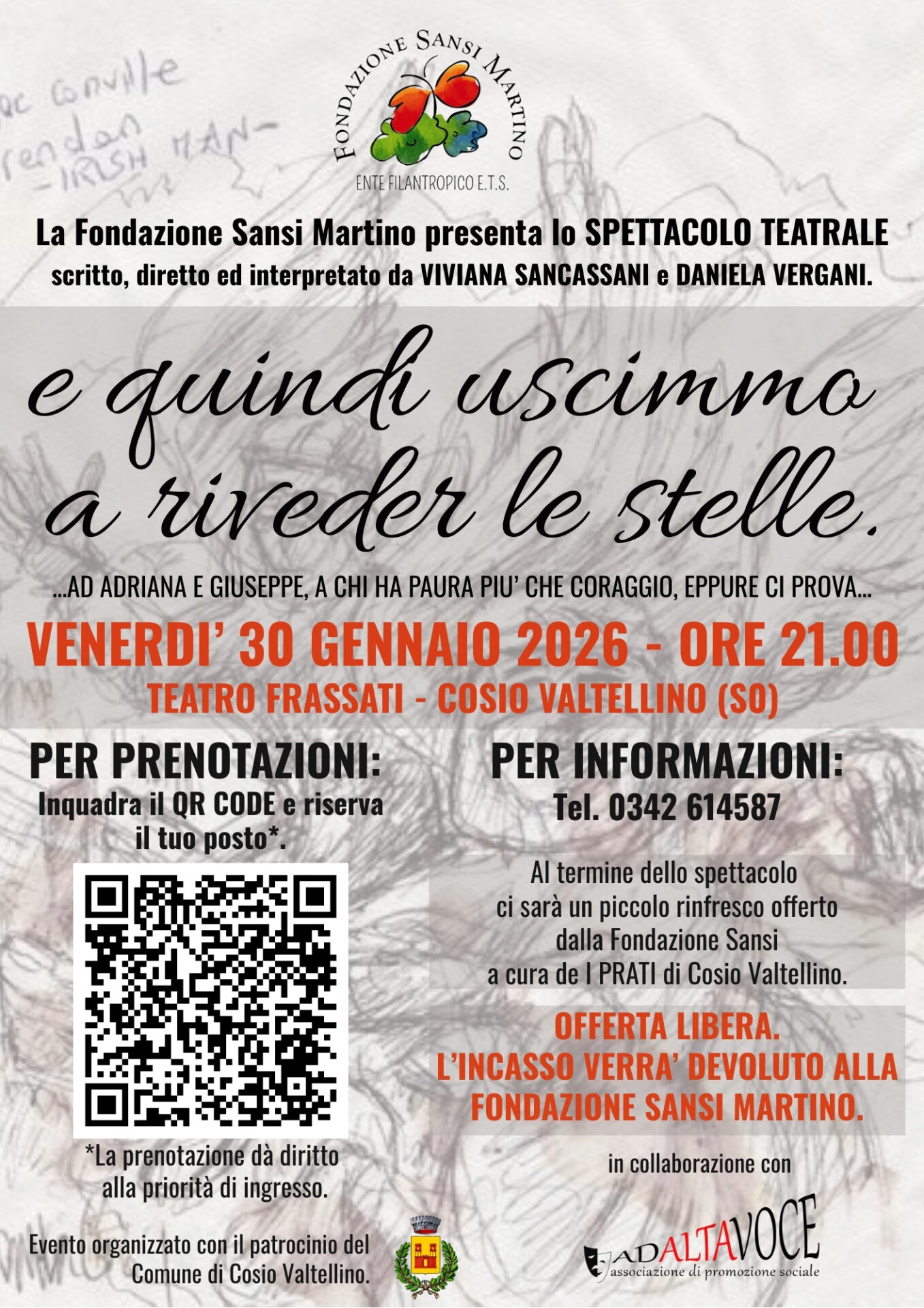 COSIO VALTELLINO – La solidarietà passa dal palcoscenico a Cosio Valtellino, dove il teatro torna a farsi strumento di memoria collettiva e impegno civile. La Fondazione Sansi Martino annuncia che venerdì 30 gennaio andrà in scena, al Teatro Frassati, lo spettacolo teatrale “E quindi uscimmo a riveder le stelle”, un’iniziativa a fini benefici promossa con il patrocinio del Comune di Cosio Valtellino e organizzata in collaborazione con l’associazione AdAltaVoce.